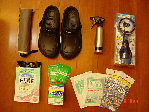 ㄚ良的裝備:摺疊傘、布希鞋、噴霧器、最新款噴水小電扇、冰涼領巾、休足時間、撒隆巴斯