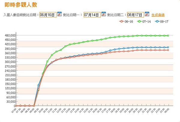 由即時參觀人數曲線圖可知開園後的30分鐘內就已經湧入了10萬人左右