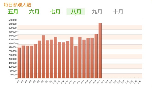 根據上海世博官方網站資料,出乎意料地在5月15日以前每天進園的人數竟然不到25萬人(如下圖),慢慢地到了六月份及七月份每日平均參觀人數均達40萬人次以上,其中六月份平均每日進園人數為436,523人次,而七月份則是444,793人次,看起來六月份適合遊世博的預測是破功了! 而八月份除了8/21當日達568,300人次以外,整體來說每天進園的人已經降低不少,平均每日進園人數降至395,513人次(截至8/22止),平均較67月每天減少50,000人左右(希望ㄚ良去世博的九月可以再降一些)。