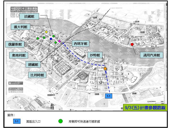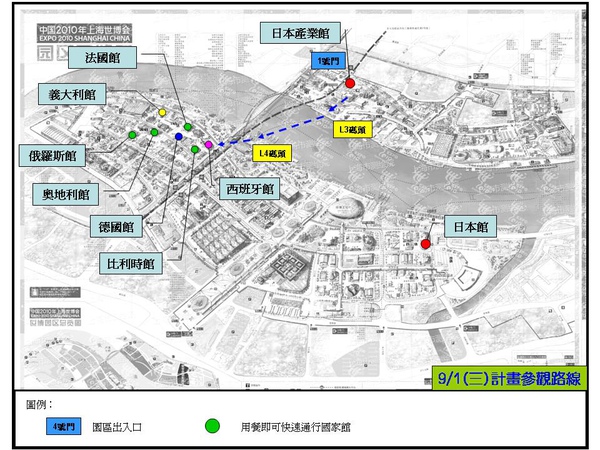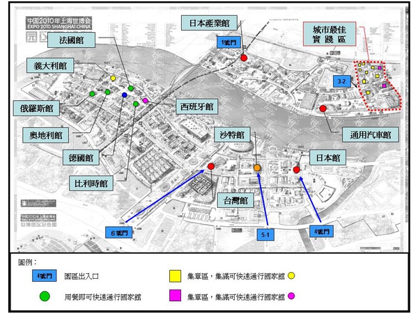 好了! 現在說說ㄚ良的計畫吧! 這次ㄚ良打算進園三天,而第一天選擇傍晚入園,一方面可以好好欣賞世博園區夜晚的燈光美景,一方面先"試試水溫",熟悉一下世博園區的環境,既然是晚上進園,那就先別去想那些爆熱門的場館了,不過根據觀察,一些熱門的場館在晚間因為遊客陸續離園的關係,排隊時間相對減少,所以ㄚ良打算第一天就悠閒地玩,先從一號門進園(離[日本產業館]近),然後到[日本產業館]排隊入館參觀(據部分網友表示,[日本產業館]比[日本國家館]還有看頭,不過如果發現要排隊超過2小時就可能選擇先放棄),接著到L3碼頭搭乘渡江船到浦東園區的L4碼頭(離歐洲館區近),然後看看[西班牙館]、[比利時館]、[德國館]、[奧地利館]、[俄羅斯館]、[義大利館]、[法國館]之中,哪個場館所需排隊時間最短就去參觀,並趁機打聽一下[法國館]、[俄羅斯館]、[奧地利館]及[比利時館]的用餐通關禮遇還有沒有,以便計畫後面兩天的參觀路線,若還有時間,就再到鄰近相對較不那麼熱門的場館走走。