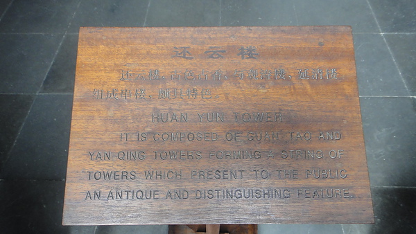 面對靜觀大廳,東西相連,為串樓形,並可通向觀濤樓和船廳,還雲樓內橫匾“還雲”,為清末上海名紳姚文?題識。 還雲樓原為上海錢業公所產業,豫園、內園屢遭戰火破壞,而此樓卻免遭劫,大有“手揮絲桐,目送還雲,西山爽氣,在我袖中”之感。