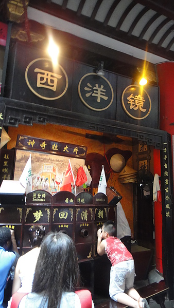 西洋鏡,遊客透過小窗看裡面的同時會有一位說書人在旁邊講故事,這大概就是早期的電影吧