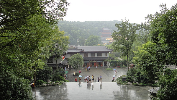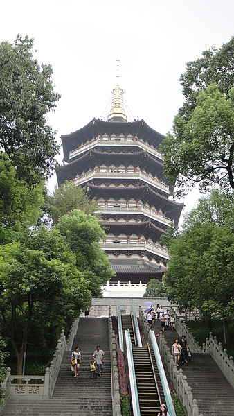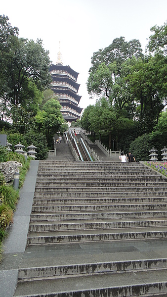 從電動手扶梯往下看,可見對面山上也有寺廟建築群,原來是頗有名氣的淨慈寺,著名的西湖十景之一「南屏晚鐘」就在淨慈寺內。