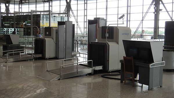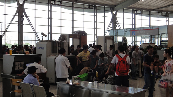 上海南站是圓形構造物,有好幾個出入口,每個出入口都設有X光行李掃描及感應門,欲搭車的旅客得先通過安檢這關,把手上大小行李都過X光,才能進入車站,通過感應門後還有公安會隨機盤查可疑人士證件。