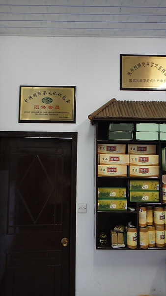 牆上掛著「中國國際茶文化研究會團體會員」及「杭州西湖龍井茶葉產銷部 國家禮品茶定點生產單位」兩面證照
