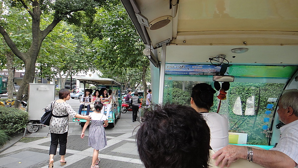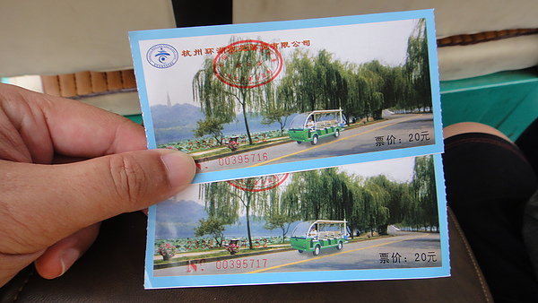 終於找到遊湖電動車了! 它只要您招手就會停車喔! 而且司機還會用麥克風為乘客介紹路過的一些名勝,搭乘費用則是依車程長短計算,基本上至少要RMB 10元,遠一點則要RMB 2030元左右,遊湖一圈則是RMB 40元(約台幣188元),不過這裡指的一圈是中途不下車的喔! 如果您中途下車後再招另一部車,就得再付一次車錢,若是選擇包車(即隨時可中途上下車),則要RMB