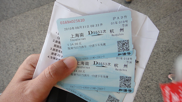 今天預計搭乘的是上午08:33由上海火車站(南站)開往杭州的「動車」,所謂「動車」,大概就是我們說的高速鐵路,不過速度似乎沒有像台灣高鐵每小時達300公里那麼快,從上海到杭州搭乘「動車」是不錯的選擇,因為它(1)有劃位、(2)速度快、(3)省時間。全程只要1.5小時左右(坐普通車得ㄎㄡ很久才會到)。