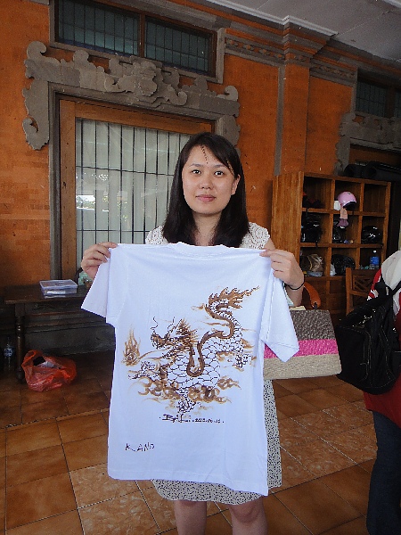 佳&良看了一看,最後選擇這位畫家,佳佳選擇龍型圖案,T-shirt則是在這兒買的(12美金/件),一但選好,畫家就會現場作畫,畫整個背部只需要約5分鐘的時間,真厲害!