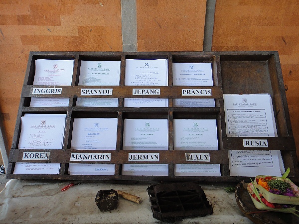 架上有各種不同語言版本的蠟染說明