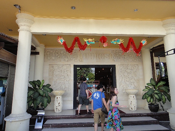自助百匯餐廳(露天)門口有兩名穿著傳統服飾的小姐(這兩位小姐待會還會在舞台上配合一群舞者表演)