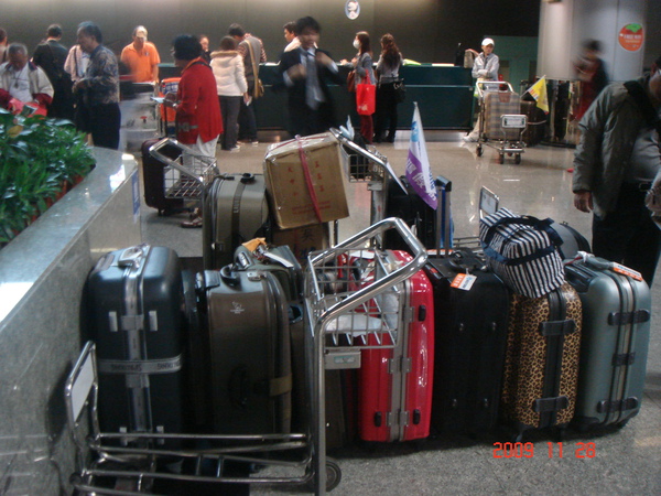 桃園機場JAL航空報到櫃檯一角-本團團員們的行李