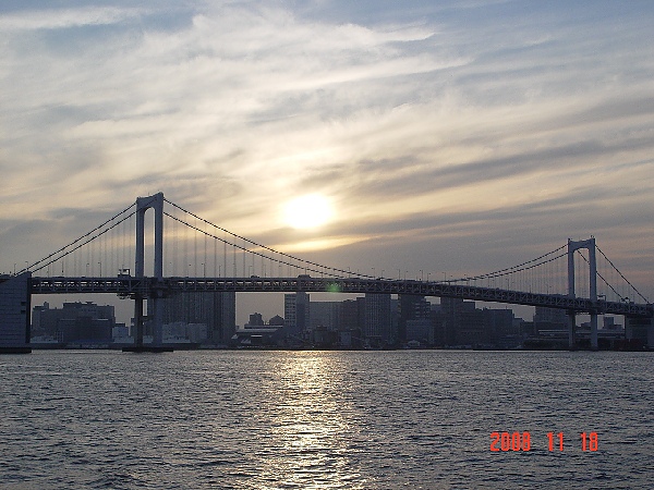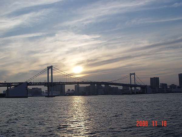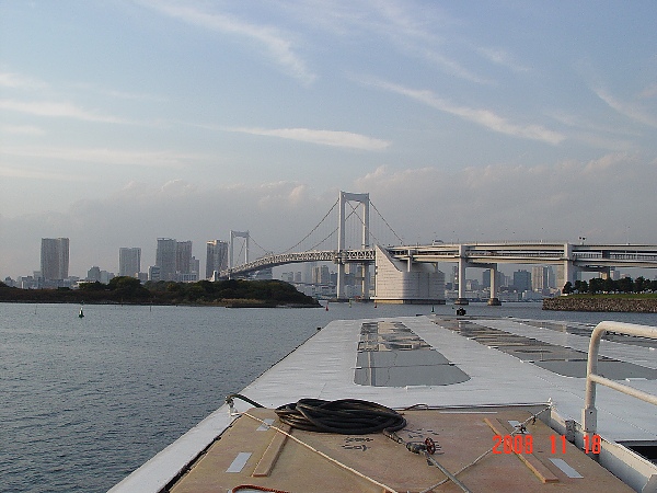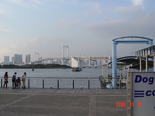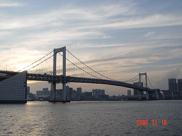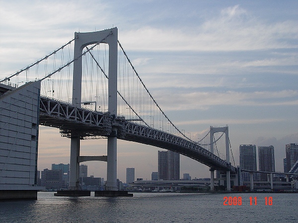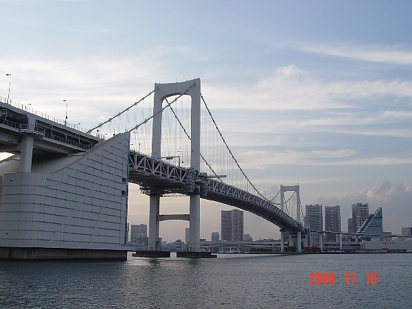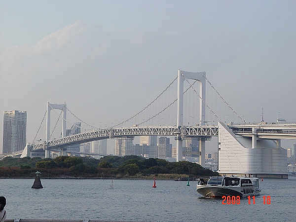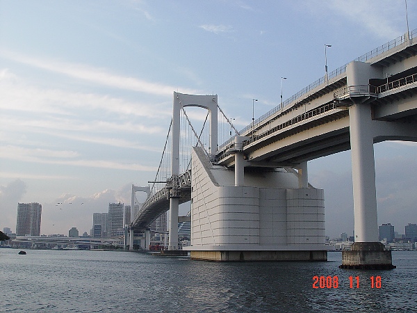彩虹橋有上下兩層,上層走汽車,下層走前面提到的百合海鷗號(東京唯一高架電鐵),佳&良來台場即是搭乘百合海鷗號走彩虹橋下層,現在則是搭乘水上巴士自橋下過,這趟來東京的最後一天則是搭乘利木津巴士走上層,三條路線各有風味