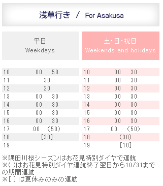日之出棧橋往淺草時刻表,也是約30分鐘就有一班船