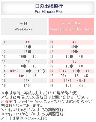台場海濱公園往日之出棧橋時刻表,約30分鐘就有一班船