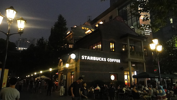 以舊式建築為店面的星巴克咖啡廳,是網路很多介紹新天地時都會出現的地標,這兒就是新天地的入口之一了,店前有很多人坐在露天咖啡座喝咖啡、聊天