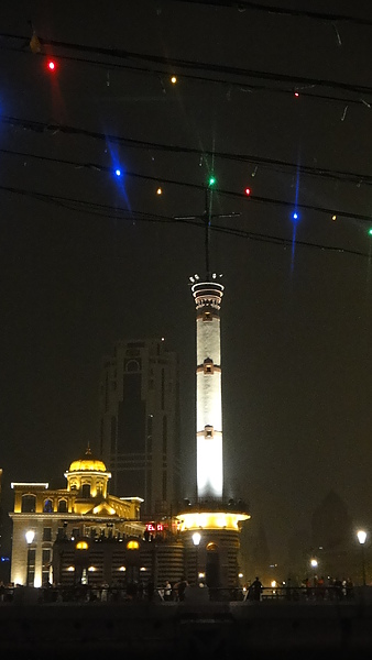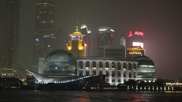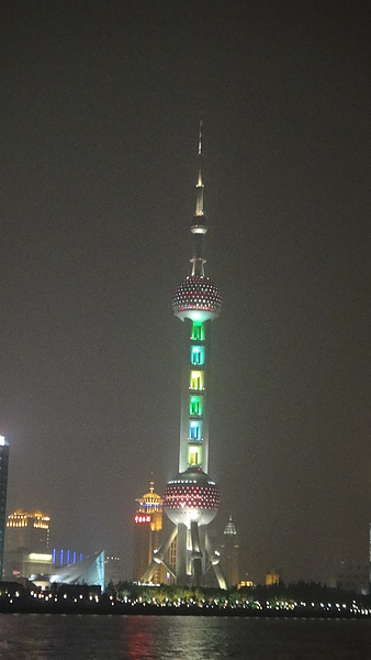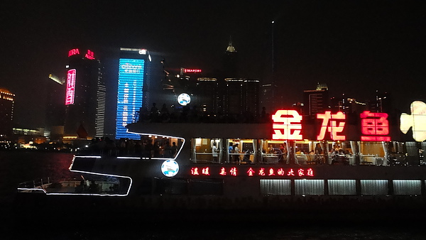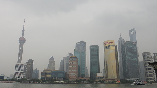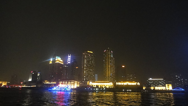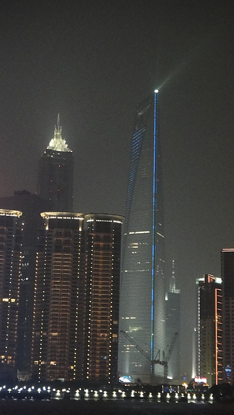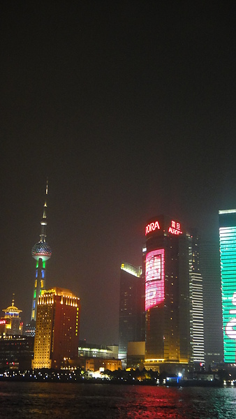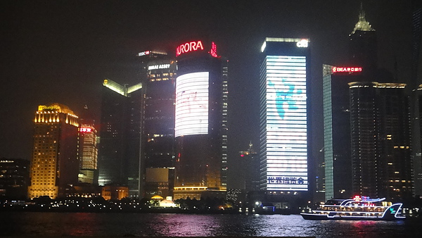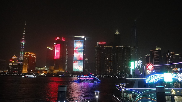 對面就是佳&良即將搭渡船過去的浦東新區,左方可見東方明珠塔,右方最高的兩棟是金茂88大樓及環球金融中心(左起),中間那棟AURORA大樓的牆面在夜間是整面的廣告電視牆
