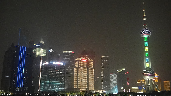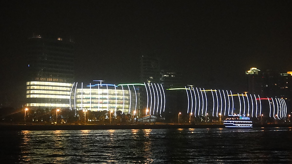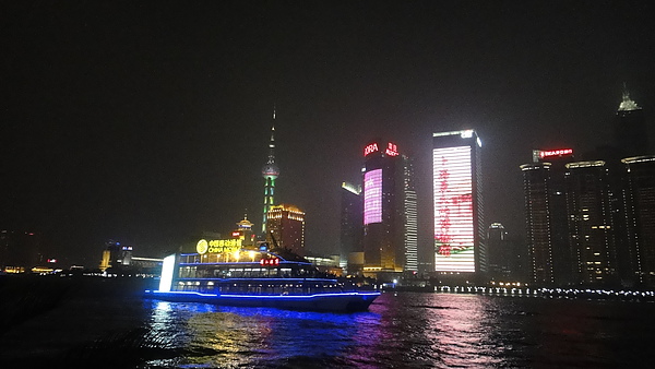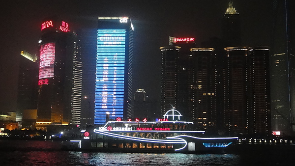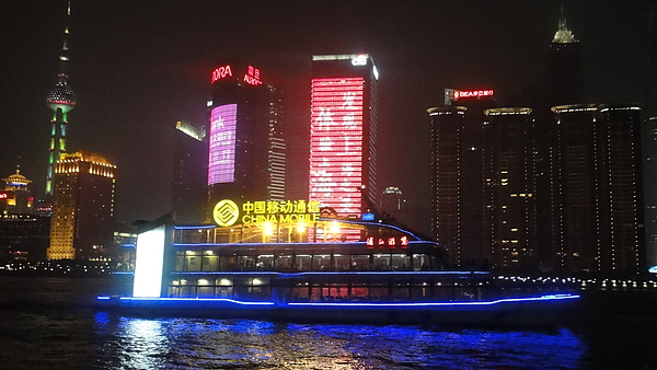 浦東新區建築群夜景,右邊最高那棟是著名的金茂88大樓,江上則有點著炫麗霓虹燈的遊船