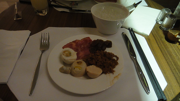 ㄚ良只夾了一些肉鬆、鹹鴨蛋、水煮蛋、火腿、脆瓜搭配粥品吃,現場還有師傅製作炒蛋,不過點了許久都沒來,也許他忘了吧,在ㄚ良第二次提醒師傅後,終於送上來了,不過味道比起日本的飯店是差了點