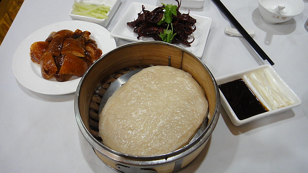 我們點了烤鴨三吃(皮、肉片、骨頭)、生煎包、水餃。