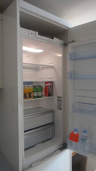 冷藏庫,裡面那兩瓶水是飯店每天都會補充的礦泉水,其他的飲料都是要收費的喔! 下面甚至還有冷凍庫,可惜ㄚ良忘了拍了。