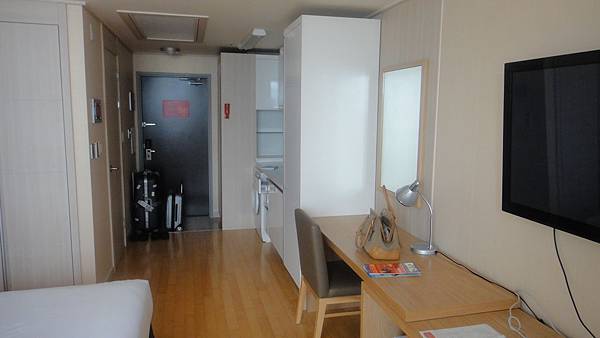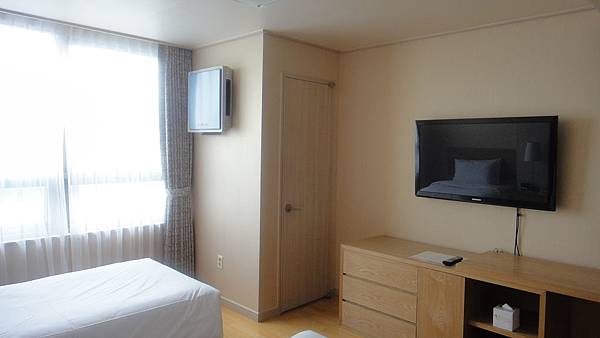 左前方牆上掛的是冷氣機,它的缺點是玄關牆上的空調控制器一樣都只寫韓文,對我們這不懂韓文的人來說,使用上實在有點不方便。還好後來發現它可以用電視的遙控器控制。