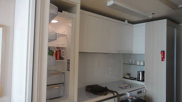 玄關旁還有mini bar,mini bar下方則有一台LG的洗衣機,而冰箱則是藏在白色的櫃子裡,盡是寫著韓文的電視產品,韓國ㄇㄟ