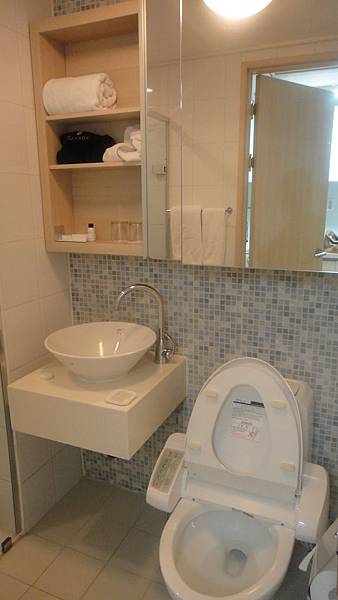 小而美的浴廁,有免痔馬桶座、整牆面的大鏡子、吹風機(櫃子裡黑色布包裡),還有淋浴裝置,可惜沒有浴缸...