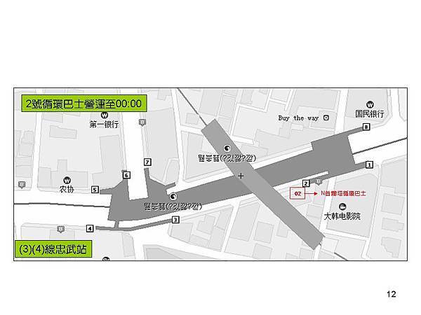 地鐵忠武站出口附近公車站及市區巴士資訊,往N首爾塔的02線循環巴士就是在這兒搭乘