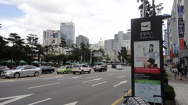 "乙支路4街"機場巴士站實景,左前方那幾棟高樓就是東大門購物商圈