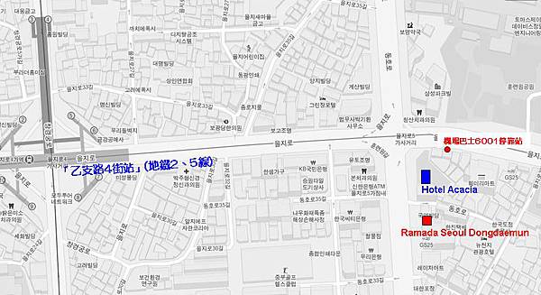 "乙支路4街"機場巴士站及飯店相對位置圖